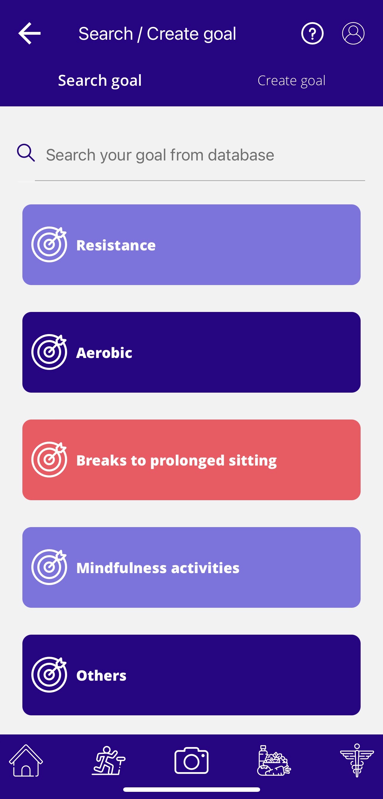 The next screen will give you the option to add your exercise goal from our database. Simply search the database or choose one of the pre-created exercise goals.