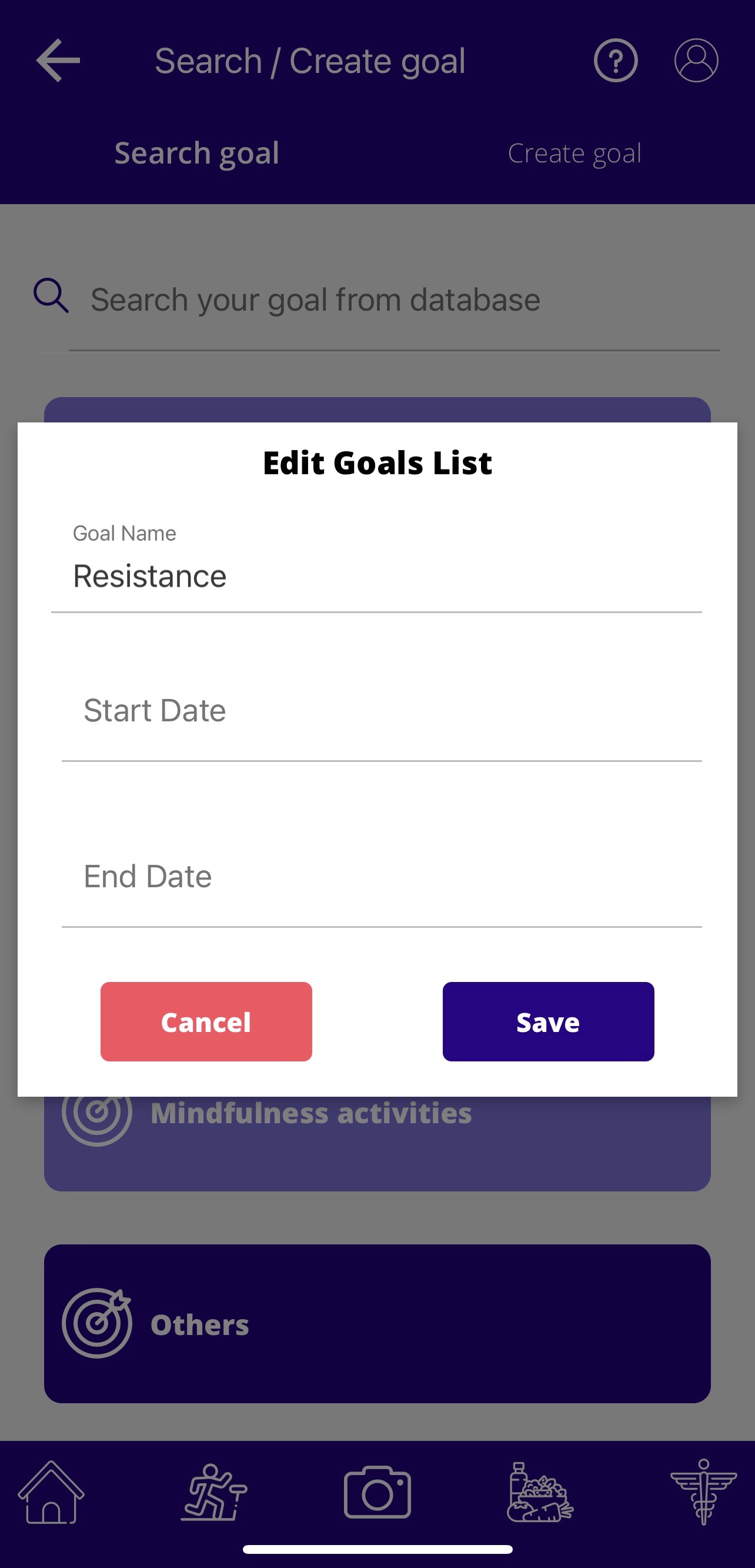 Click on the pre-created exercise goals to edit and add start and end dates and click ‘Save’ to create a goal.