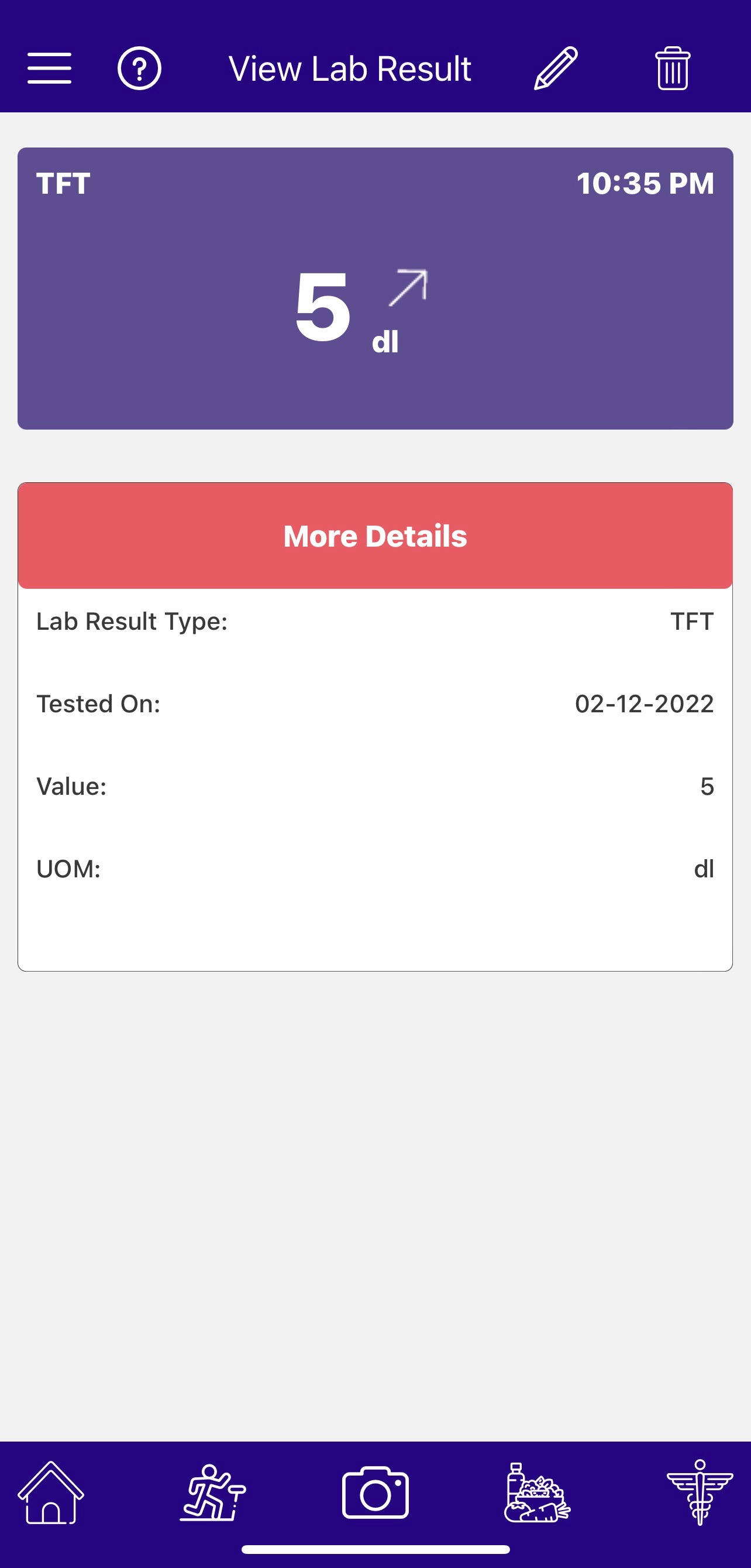 Click on the menu option to navigate to Lab Results and add a new lab result. Click on ‘+' button in the lower right corner. On the next screen, fill out details regarding your test and click ‘Save’.