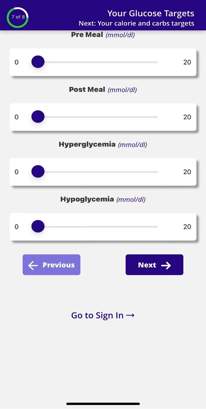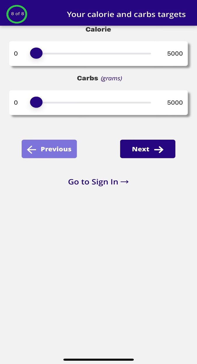 Once you click Next, the following screen will ask you about your calorie and carbohydrate target. Move the cursor right and left, set up your targets, and then press ‘Next’.