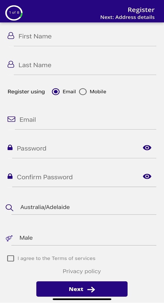 You will be asked for your basic information on the next screen. Fill out the details, click on 'I agree to the terms of services', and press ‘Next’.