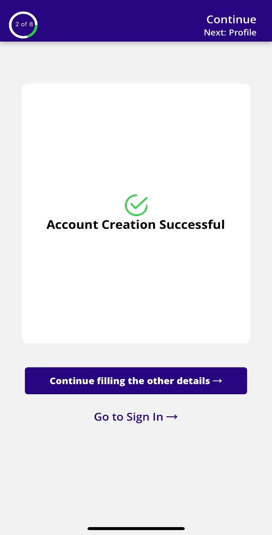 After you press continue, you will see a screen ‘Account Creation Successful’. Then, on the same screen, click on ‘Continue filling the other details.’
