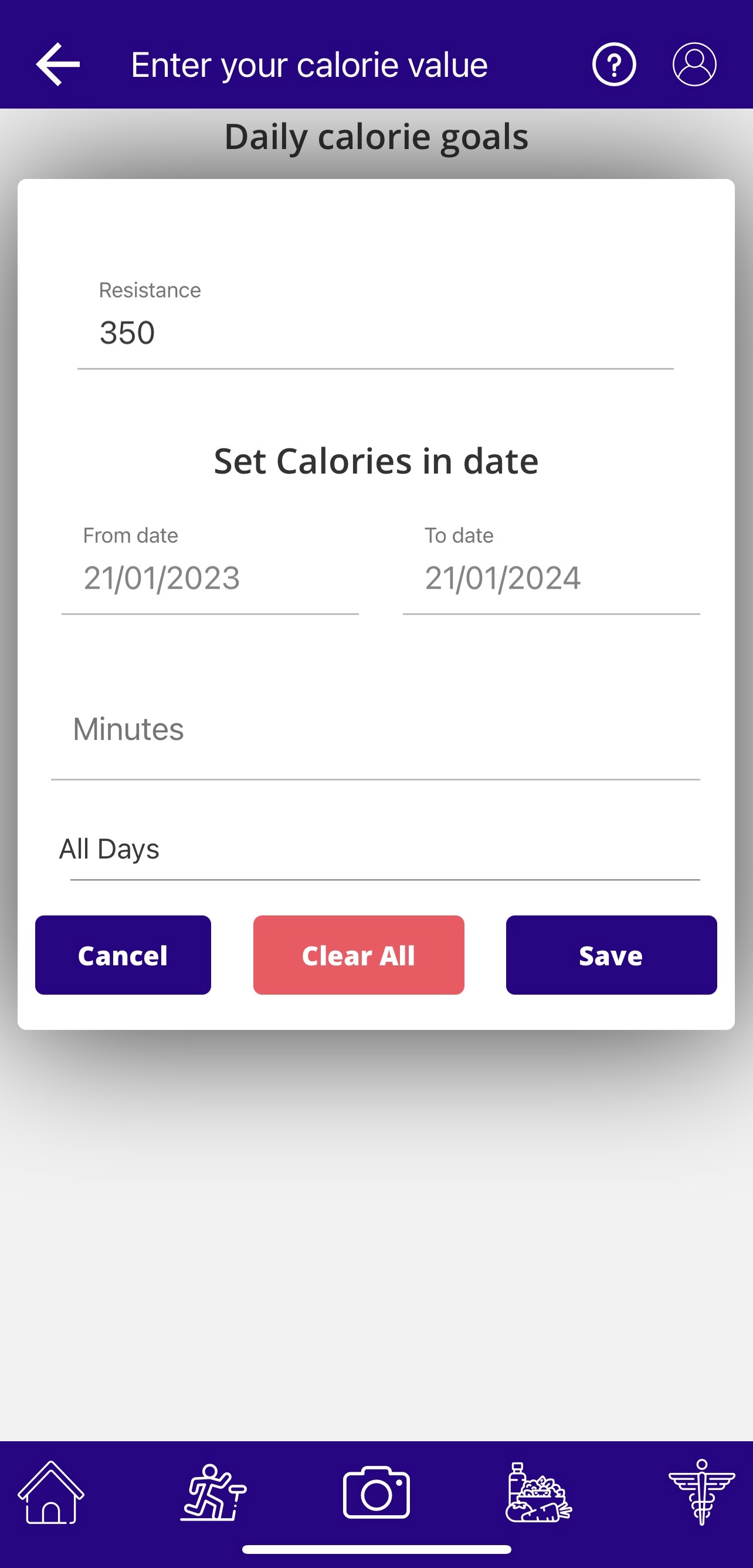 Next, enter the caloric value you wish to burn every day. Set the start and end dates and minutes and select the days of the week (weekend or weekdays or all days) you are planning on following this.