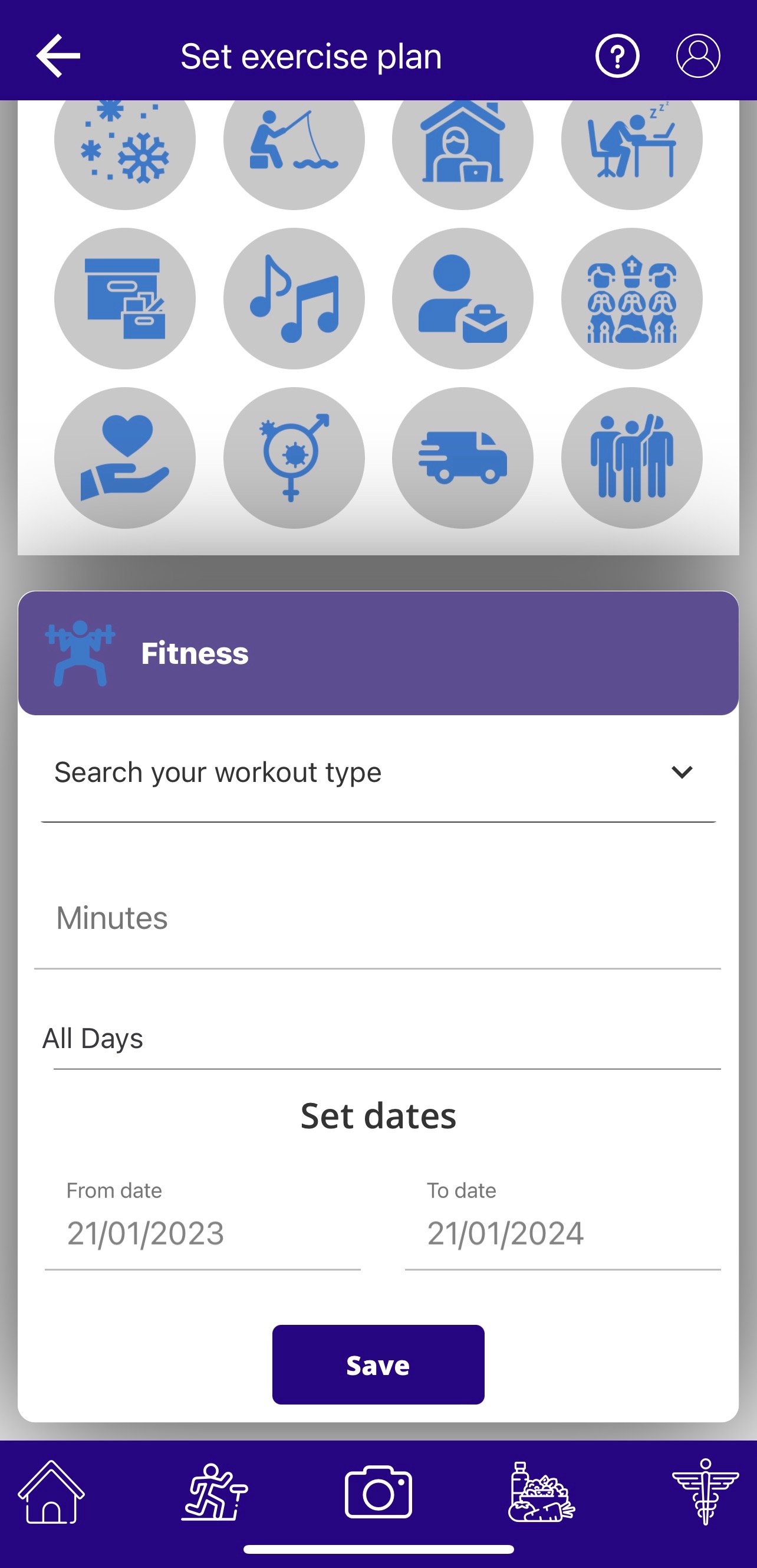 Next, select your workout type, minutes, days, and dates for this exercise regimen and click ‘Save’.