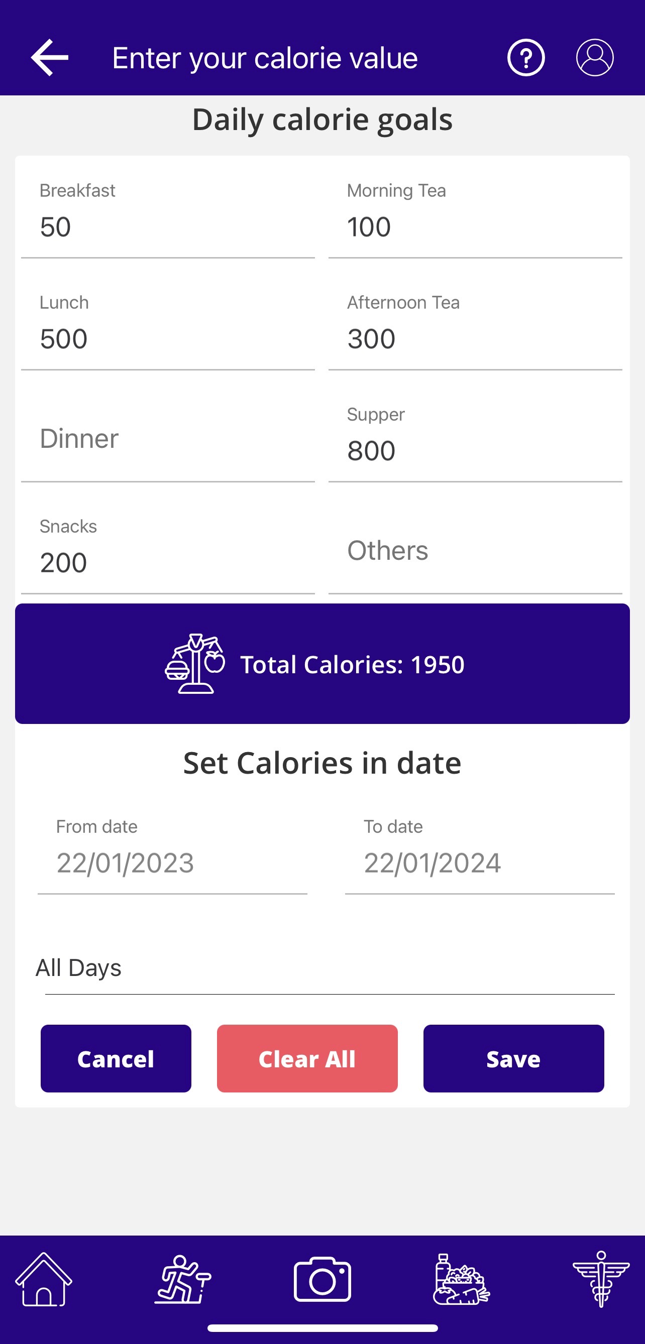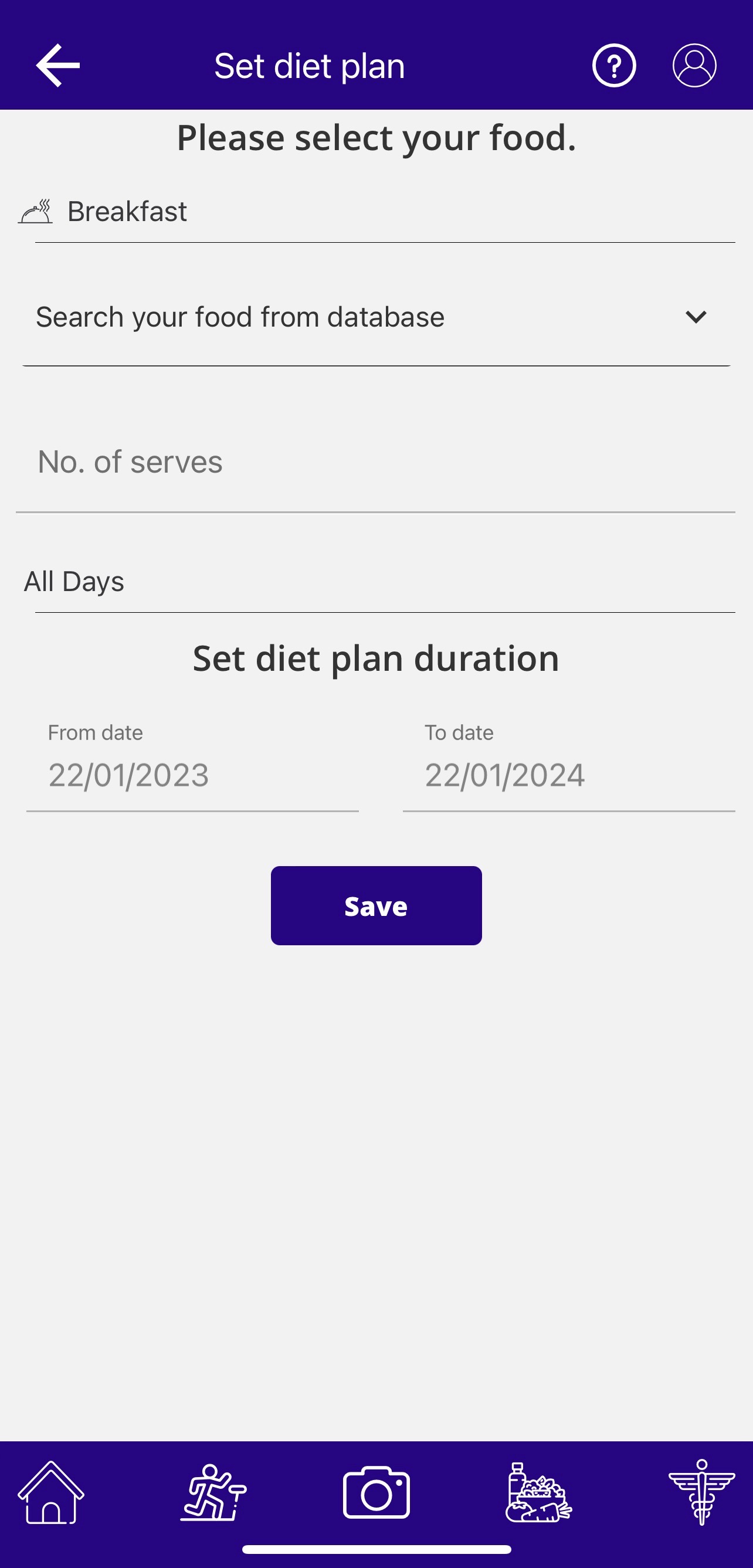And then, set the start date and end date and select the days of the week (weekends or weekdays or all days) you plan on following this caloric-value diet. Click ‘Save’ once done.