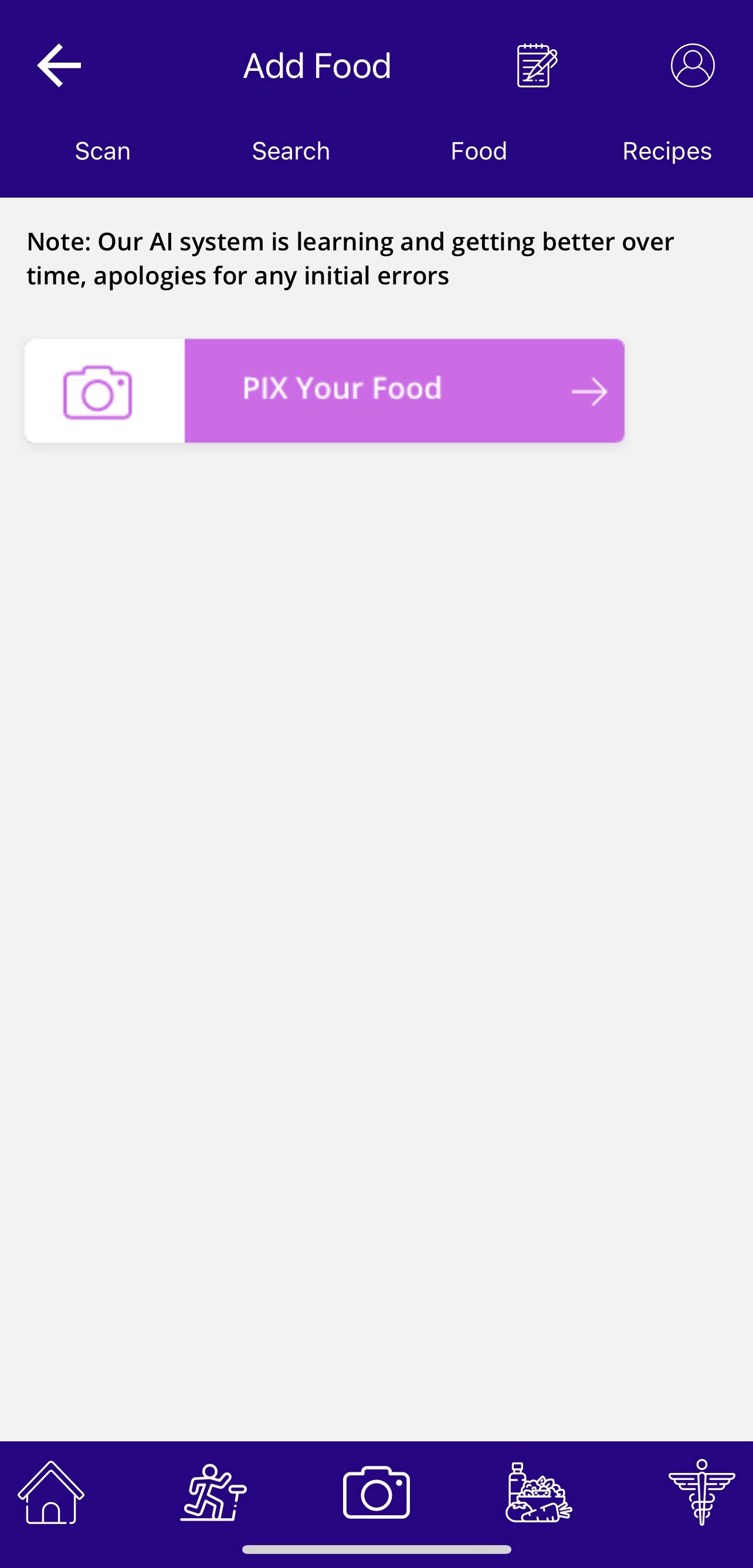The next screen will give you the option of ‘Pix Your Food’. Click on it and take a picture of your food to enter it in your app.