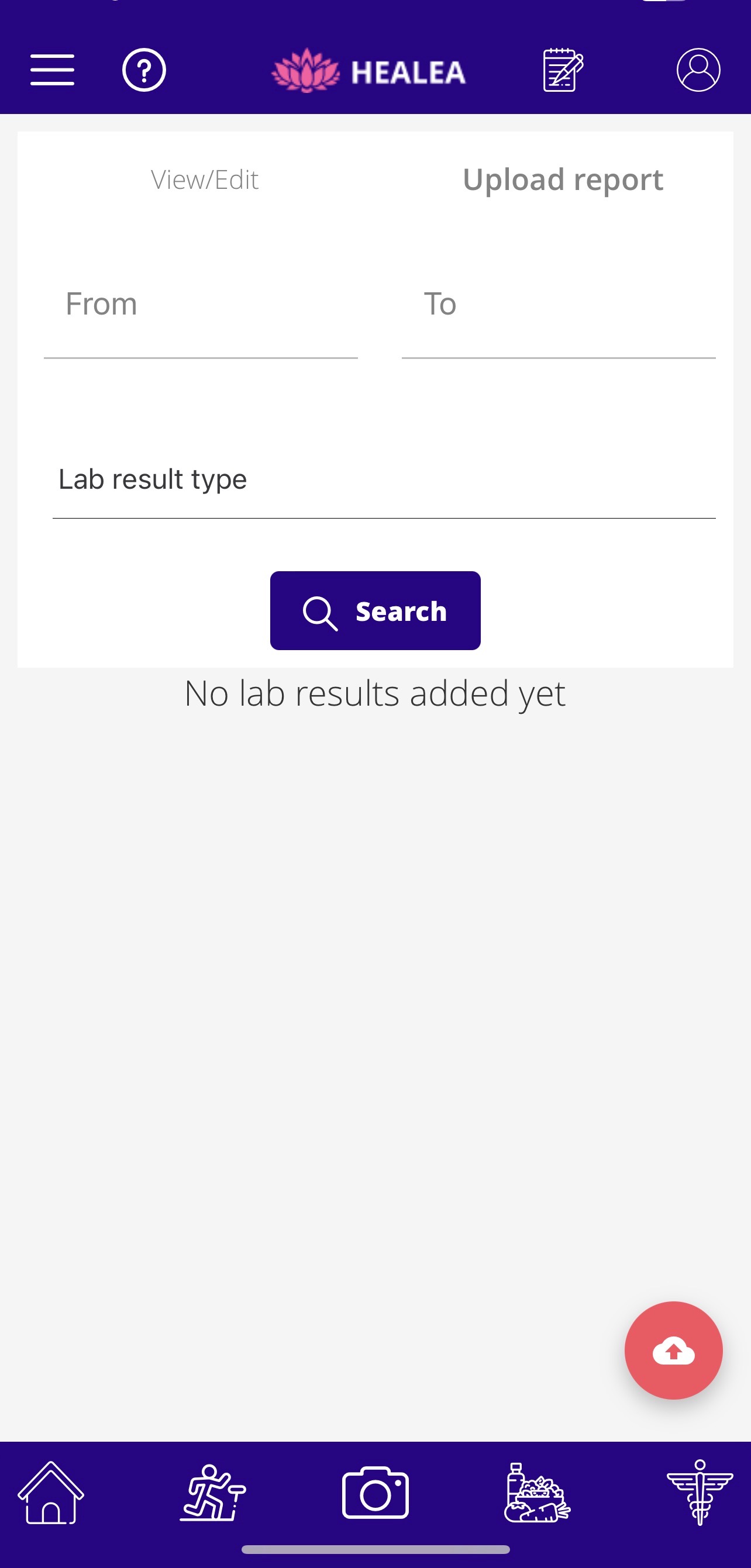 Click on the menu option and navigate to the Lab Results. Now click on the ‘Upload Report’ tab on the right-hand side of the screen. Enter the dates and type of the lab results and press ‘Search’.